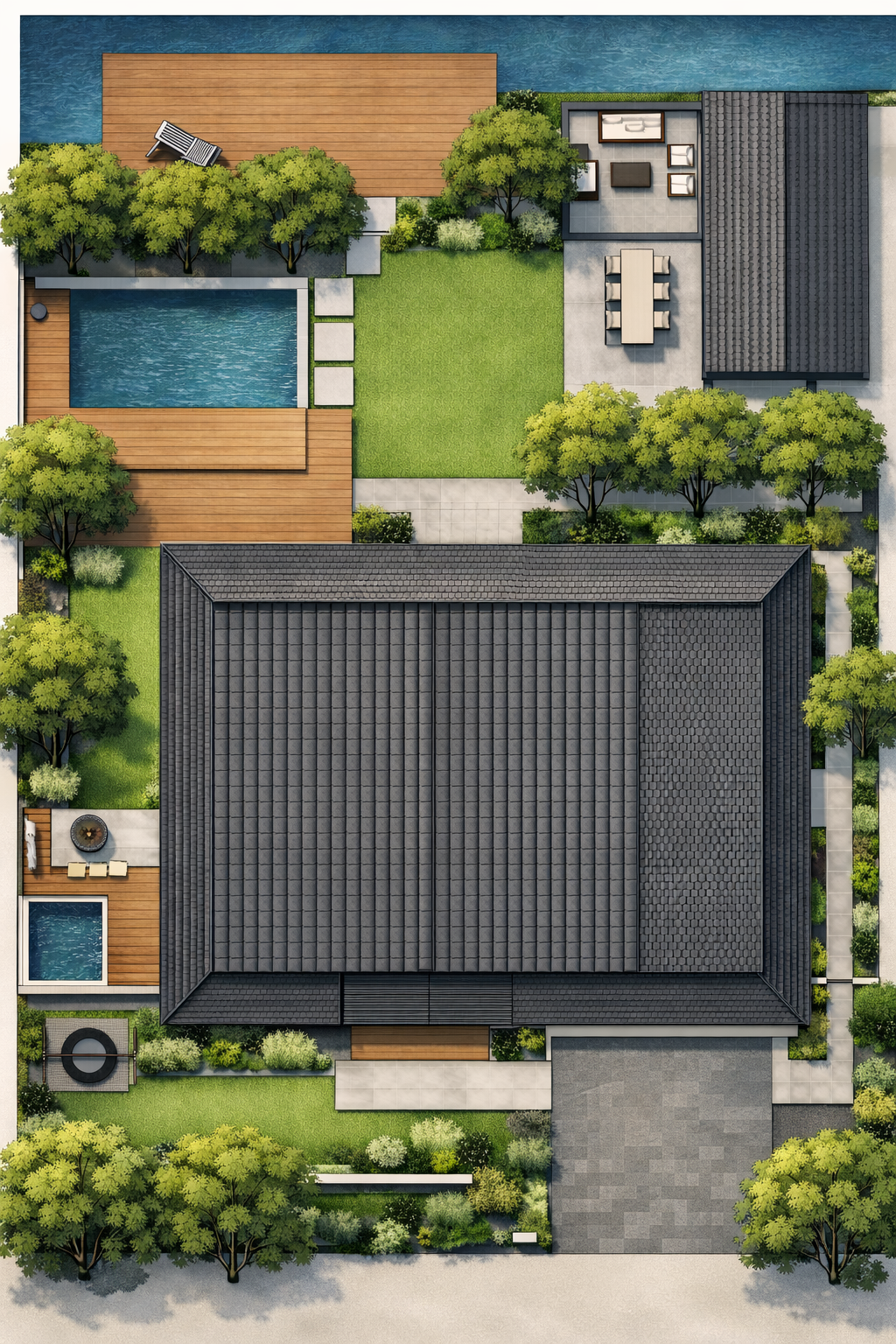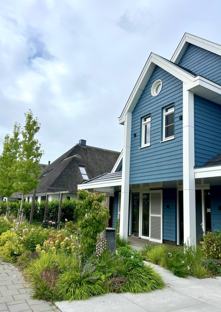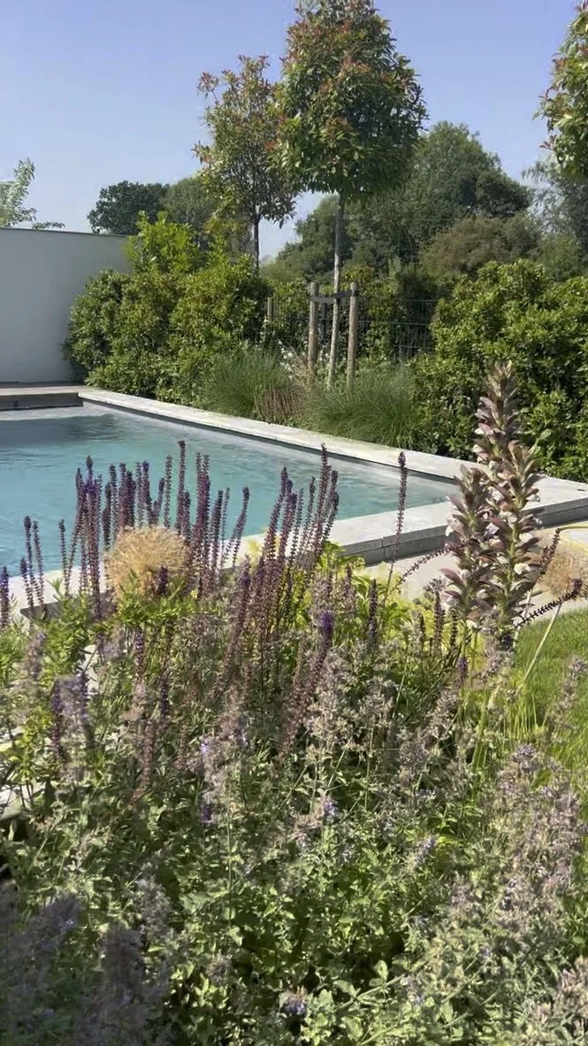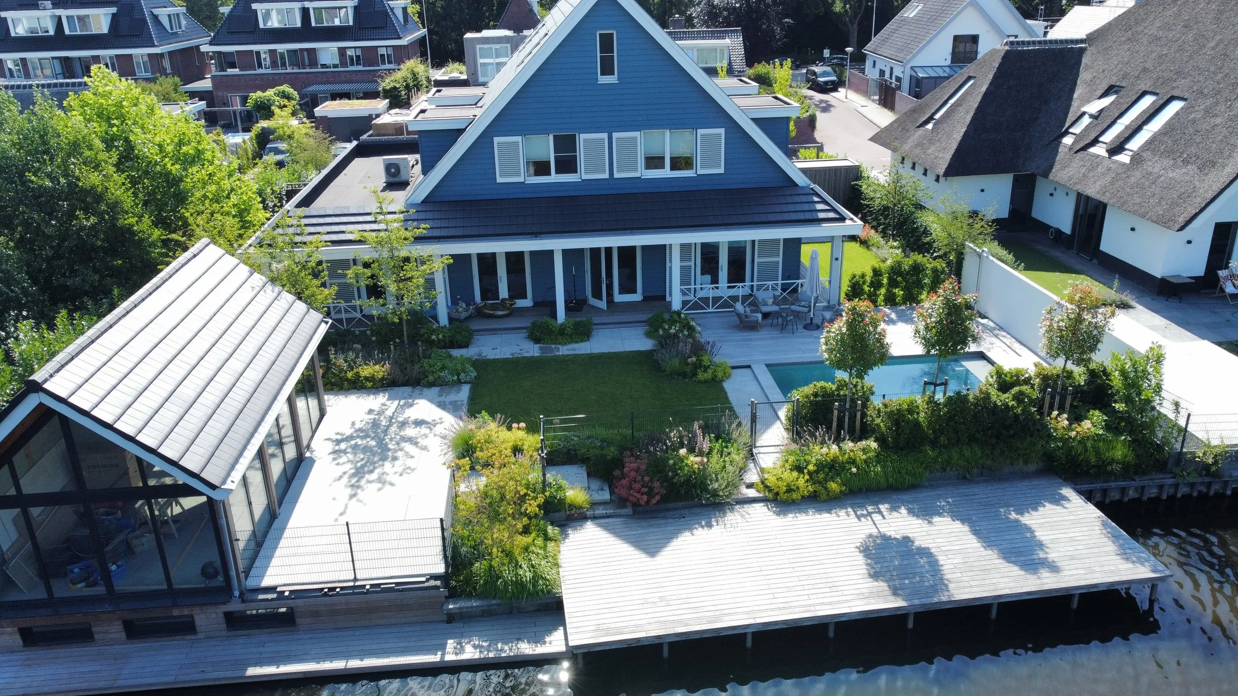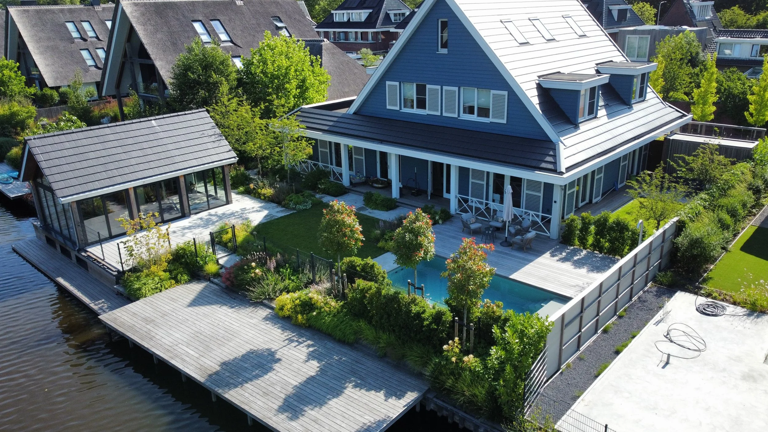 In het concept ‘Hamptons chic’ heeft dit iconische blauwe huis een tuin gekregen met moderne & strakke lijnen in combinatie met natuurlijke beplanting. Het contrast tussen strak & los, tussen de moderne materialen & het warme hout, tussen het blauw en wit van het huis & het frisse groen van de beplanting en de bomen. Echt een tuin waar alles kan: ontspannen, spelen en sporten in en rond het zwembad, spelen op het gazon, en eindeloze borreltjes, feestjes en etentjes organiseren op de terrassen met vrienden en familie.