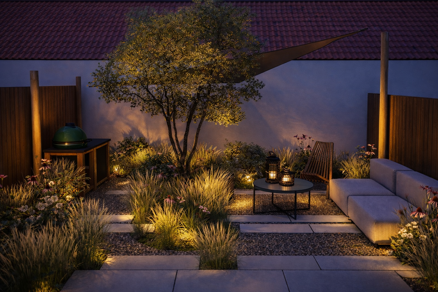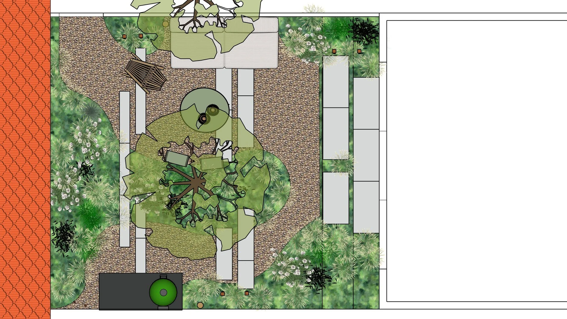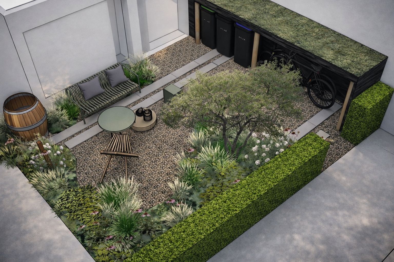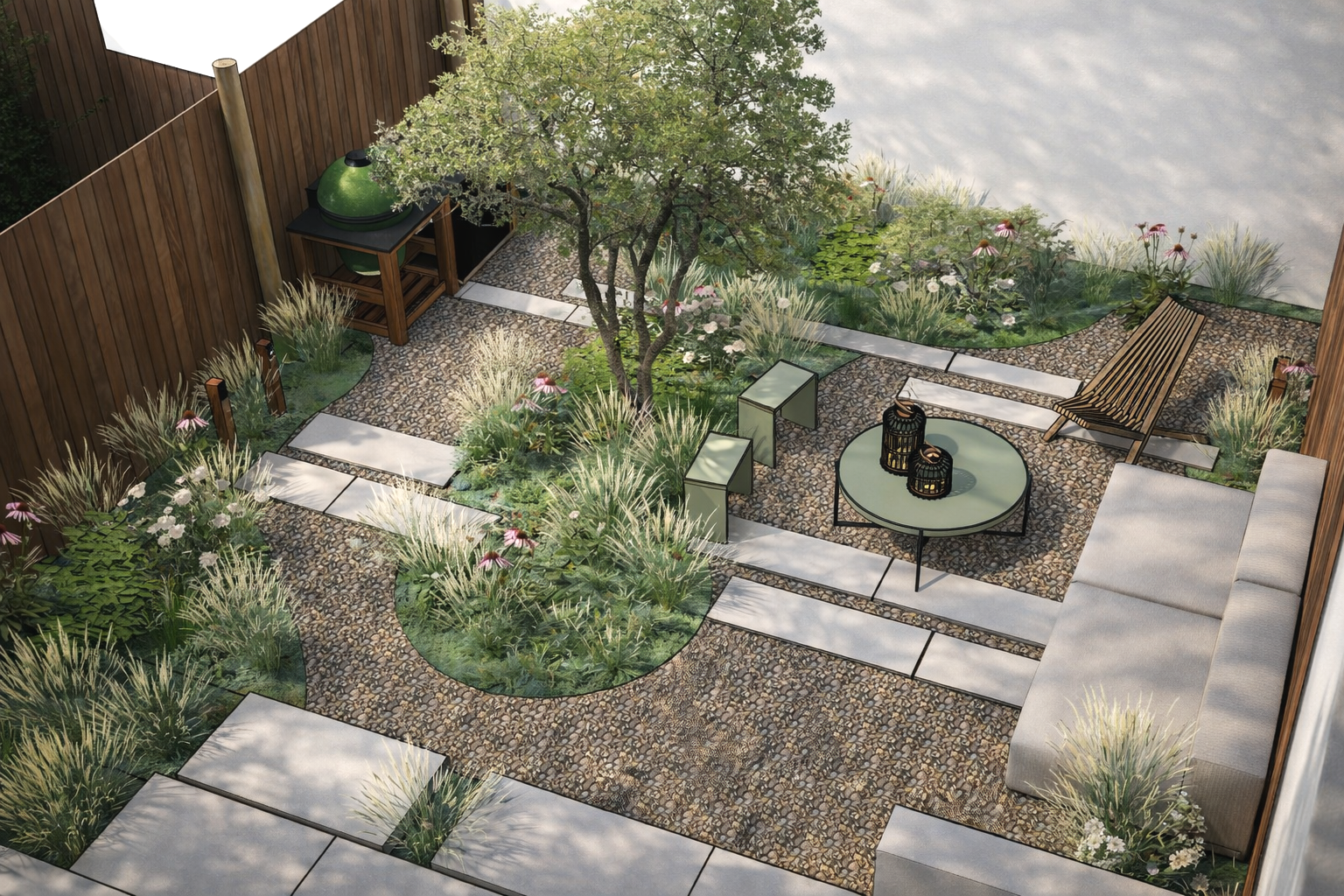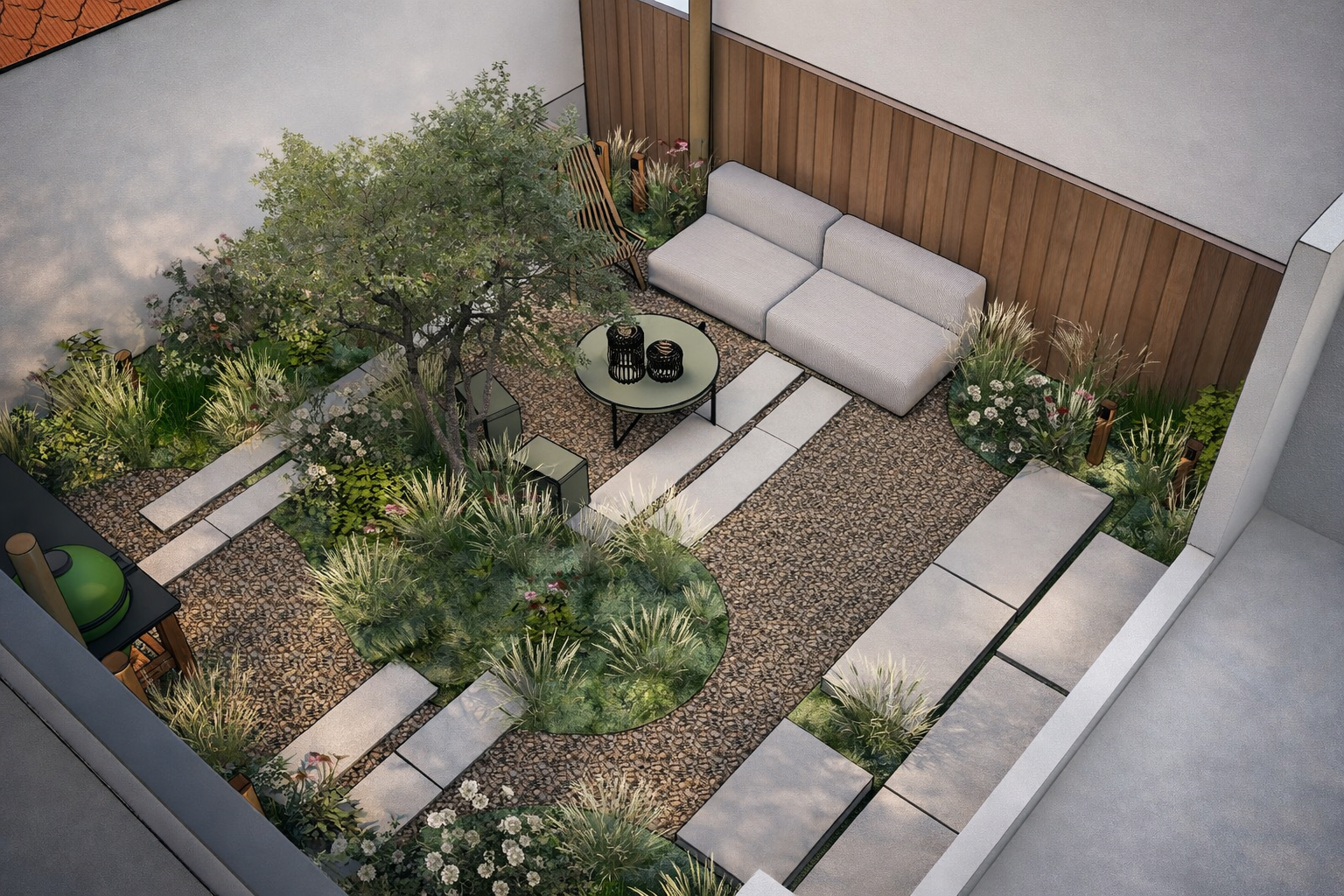In deze kleine tuin creëren we een duin- en strandgevoel door te werken met lichte zandtinten, vergrijzende houten elementen en wuivende siergrassen. De beplanting bestaat uit luchtige grassen die beweging en zachtheid brengen, aangevuld met planten met grijstinten en accentkleuren eigen aan de kuststreek. De Schellevis tegels in aflopende groottes creëren een optische illusie en maken de tuin groter. Groen start al direct bij de gevel voor een optimale groen ervaring.